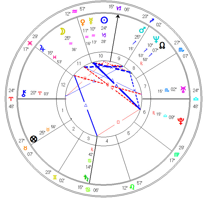 The question that was asked highlights the current transit of Saturn square Venus. Natal Venus is in 11° Aquarius, and Transiting Saturn is currently at 10° Scorpio, making a square aspect to Venus. Venus under such an energy impact causes strains on relationships, and Venus as the ruler of the 7th house adds to the focus on the marriage relationship, and the fact that Saturn is also in the seventh house adds to the pressure.