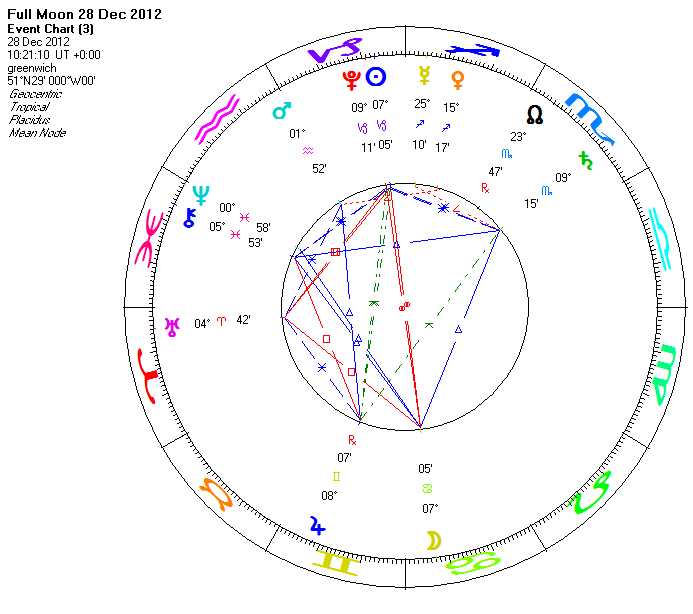 The horoscope of the full moon is so interesting featuring almost all of the major aspects formations astrologers use: we have the T cross, the grand trine, the kite, and even the yod.