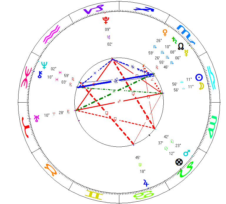 The Horoscope features many stressful aspects besides the Sun/Moon T square. We have Venus, Libra ruler in a stressful aspect to Mars, and when those two are in such an aspect, the tendency is to fight, hurt and get hurt from those we love most.